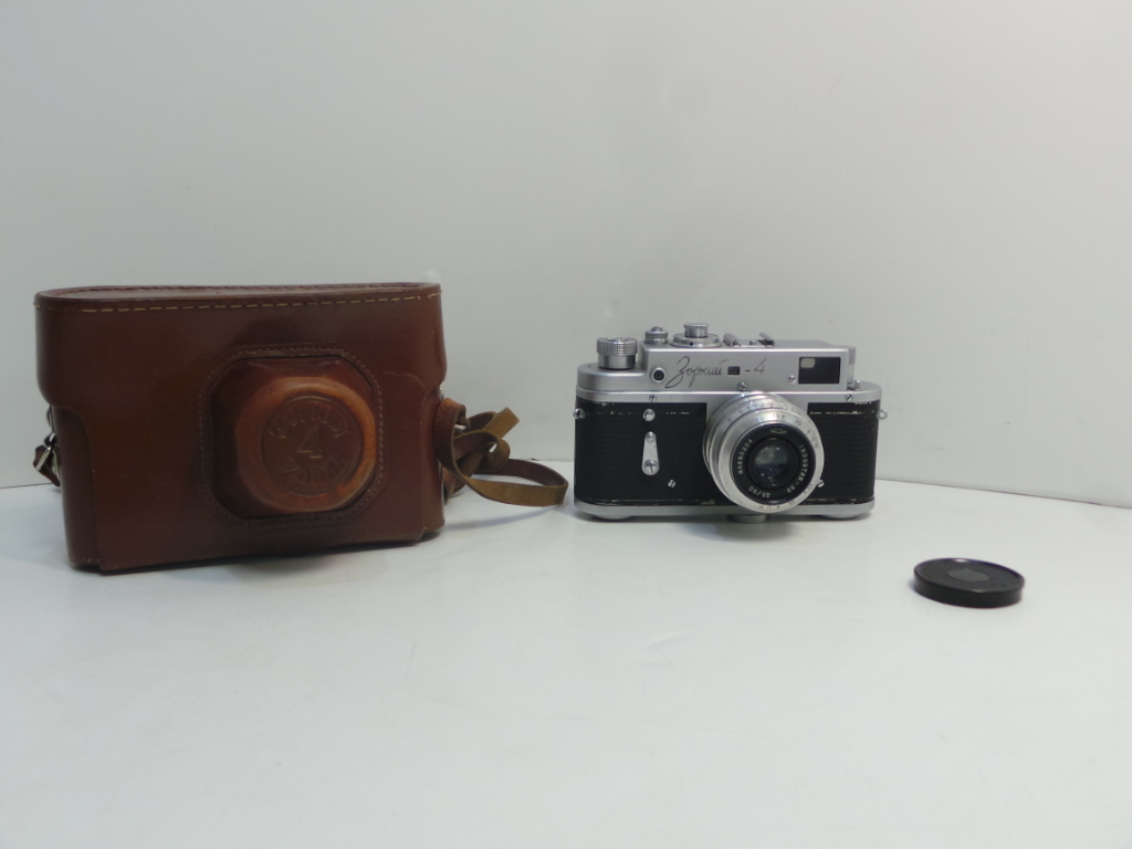 Фотоаппарат Зоркий-4 с объективом «Индустар-50» 3,5/50 , выдержка В, 1, 2, 5, 10, 25, 50, 100, 250, 500, 1000 , видоискатель совмещён в одном поле зрения с дальномером , имеет диоптрийную поправку +/- 2,5 дпт , кратность увеличения дальномера — 1,15х . Чехол в комплекте. Имеются потертости на корпусе.