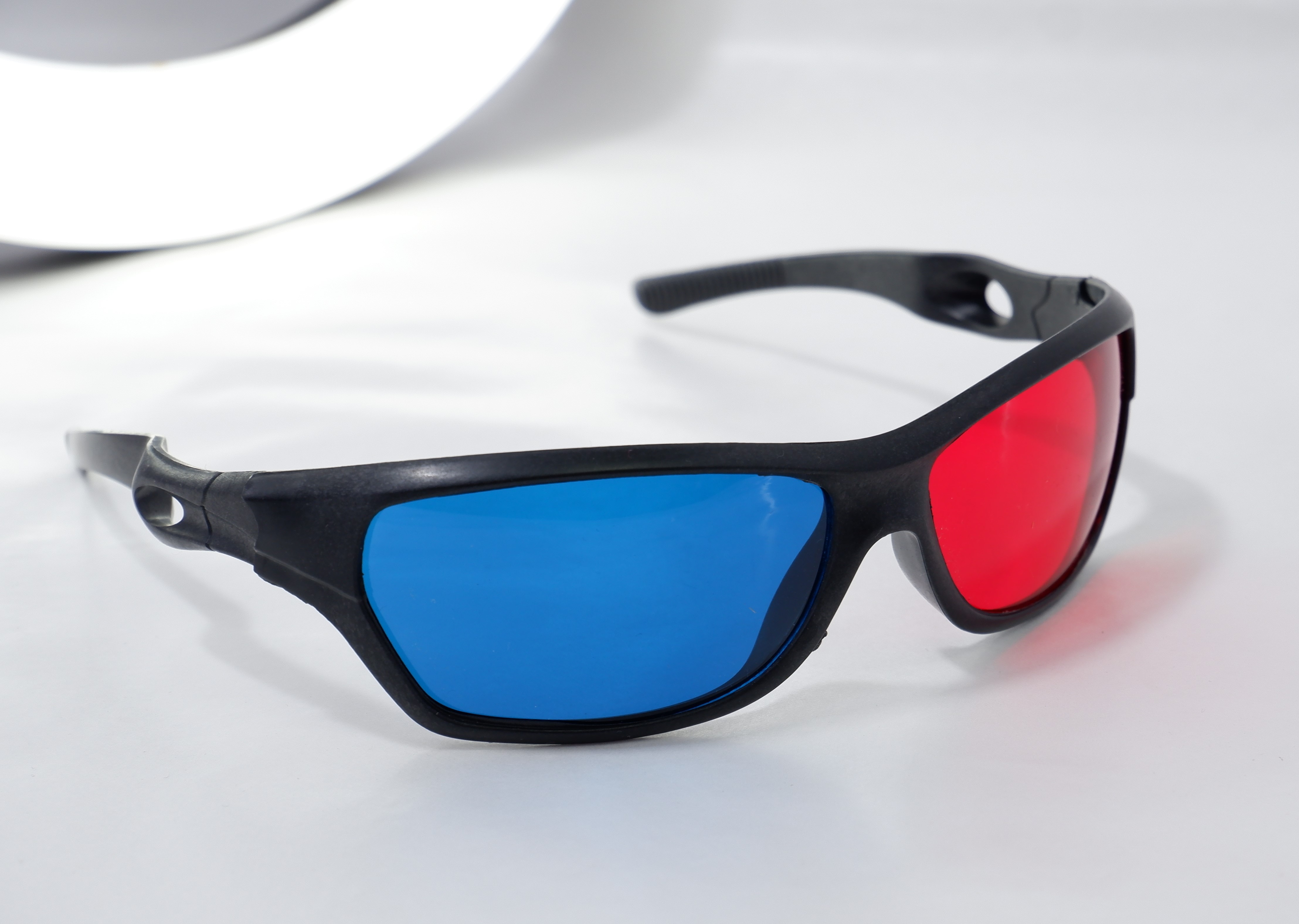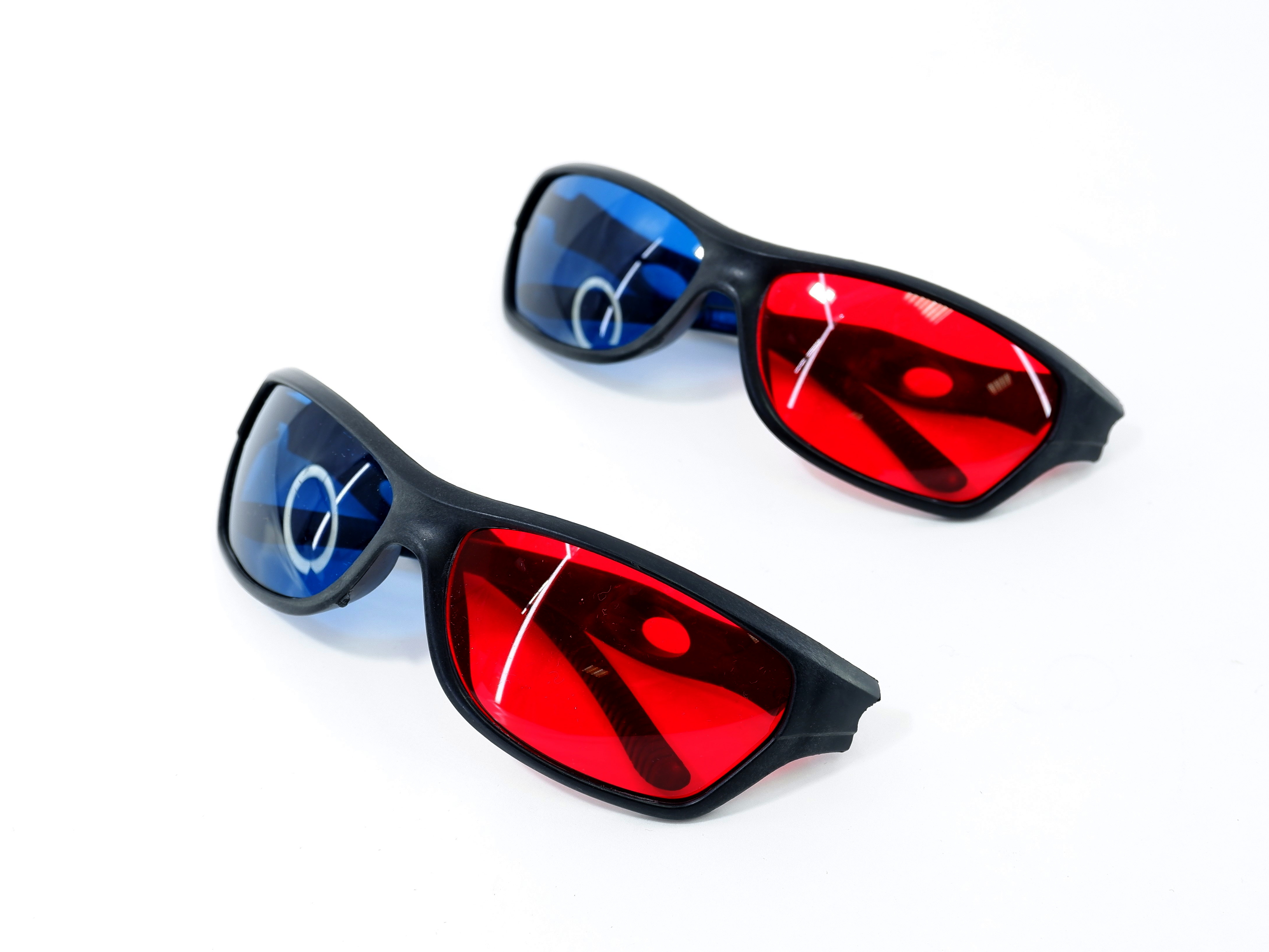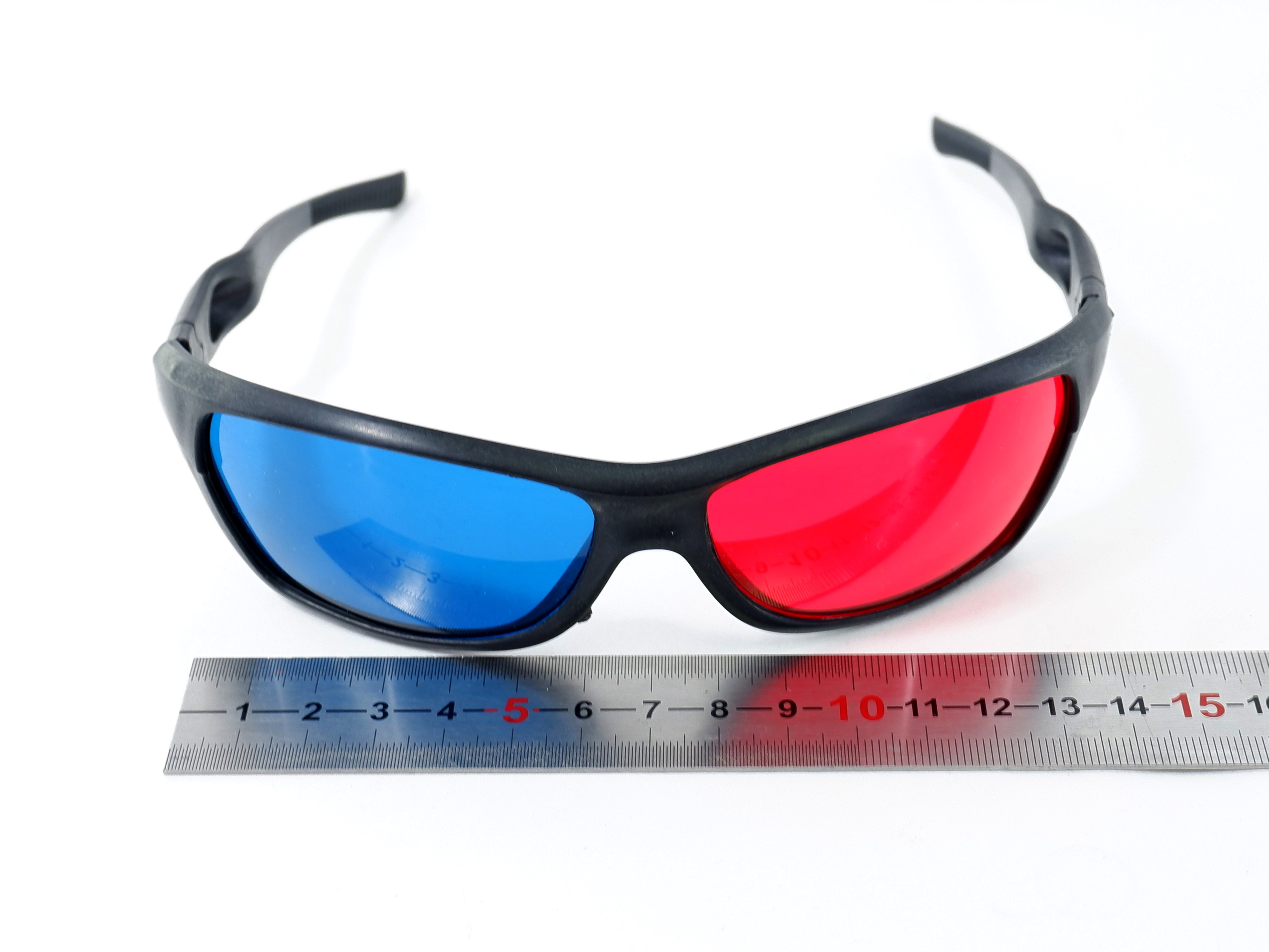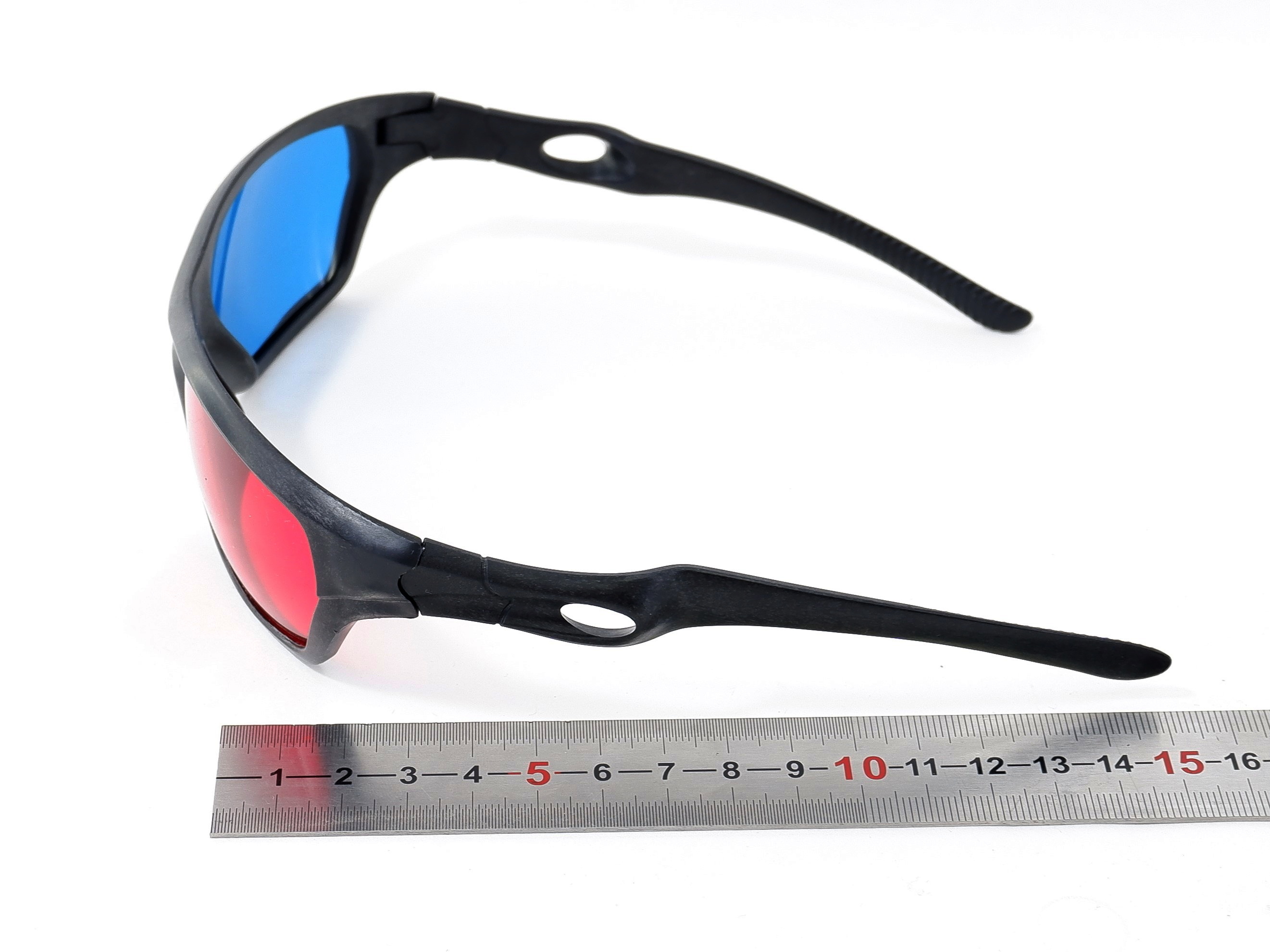 Черная пластиковая оправа и красный и голубых линз.