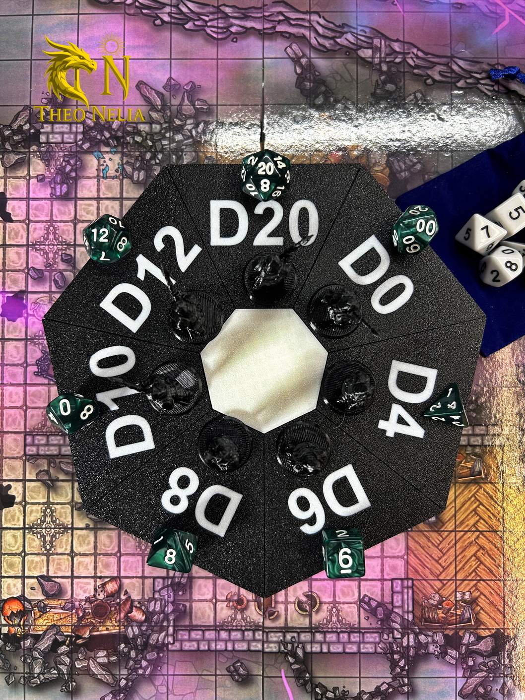 Дайсница крайне удобна для ведения игр с средним и высоким уровнем игроков и классом опасности существ в DnD, уже на 3 уровне заклинаний «огненный шар» требует броска целых 8 костей К6, наличие сразу 8 комплектов дайсов ускоряет игровой процесс, а для структурирования хранения такого количества отлично подходит наш «атрибут мастера». Можно просто и удобно открыть секцию “D6” и перевернуть шкатулку, не опасаясь за высыпание других кубиков. Так же можно поставить в центр игрового стола, дав всем игрокам доступ сразу ко всем костям, не раздавая каждому по паре наборов, все равно для больших бросков урона игрок будет собирать необходимы номинал со всего стола. А с этой шкатулкой проблема решается сразу, да и смотрится она прекрасно!