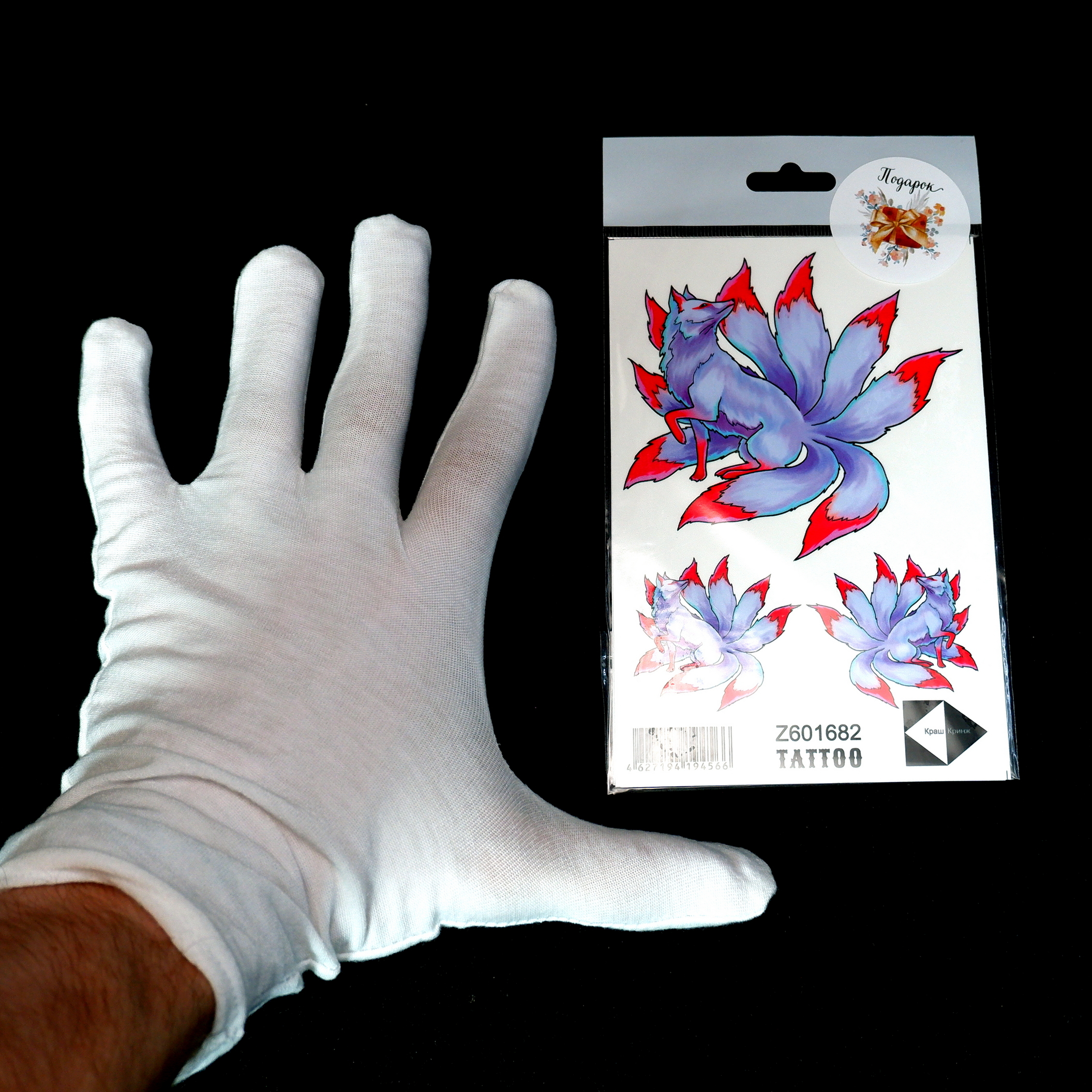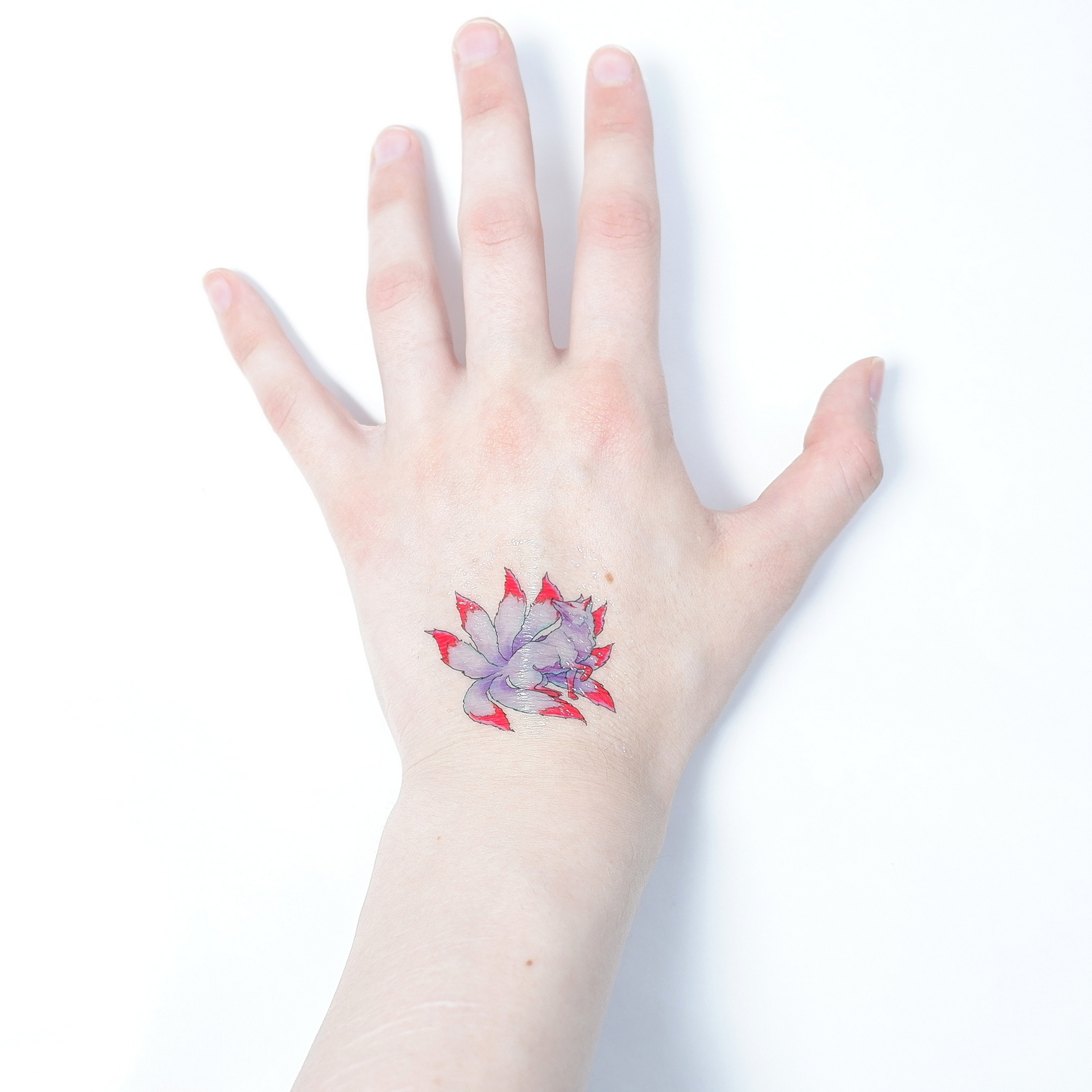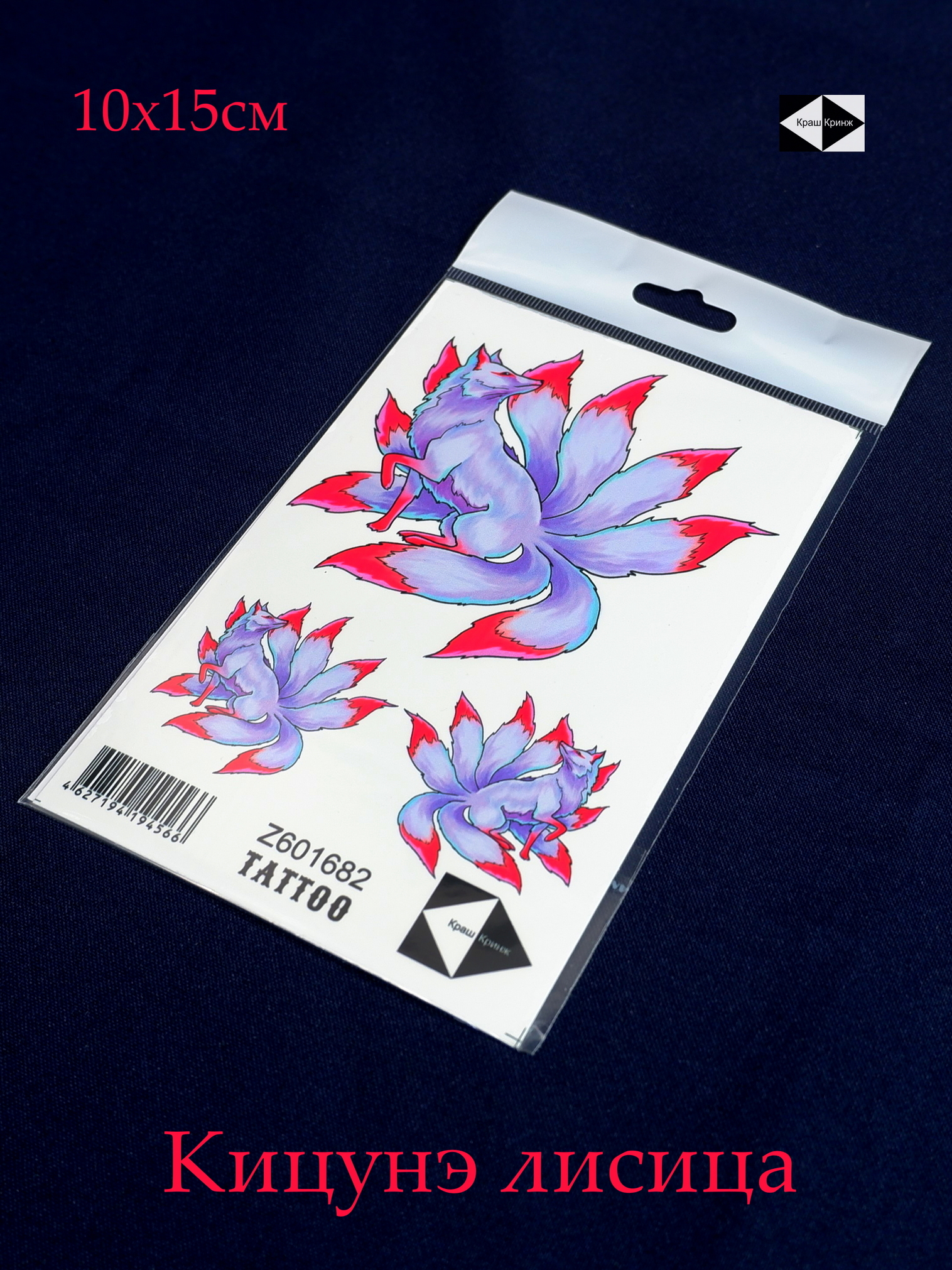 В подарок идет переводная татуировка Духа лисы — защитницы : девятихвостая лисица. На одном листе сразу три переводные татуировки! Девятихвостая лиса выполнена в нежных бело-фиолетовых тонах, а окончания каждого из девяти хвостов подчеркнуты ярким красным цветом.
