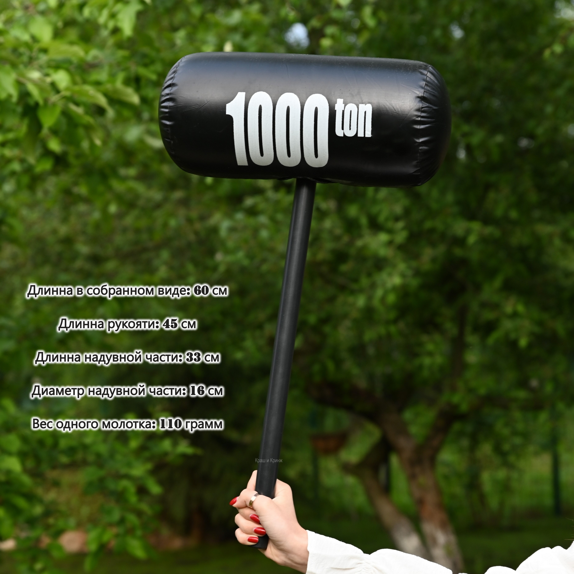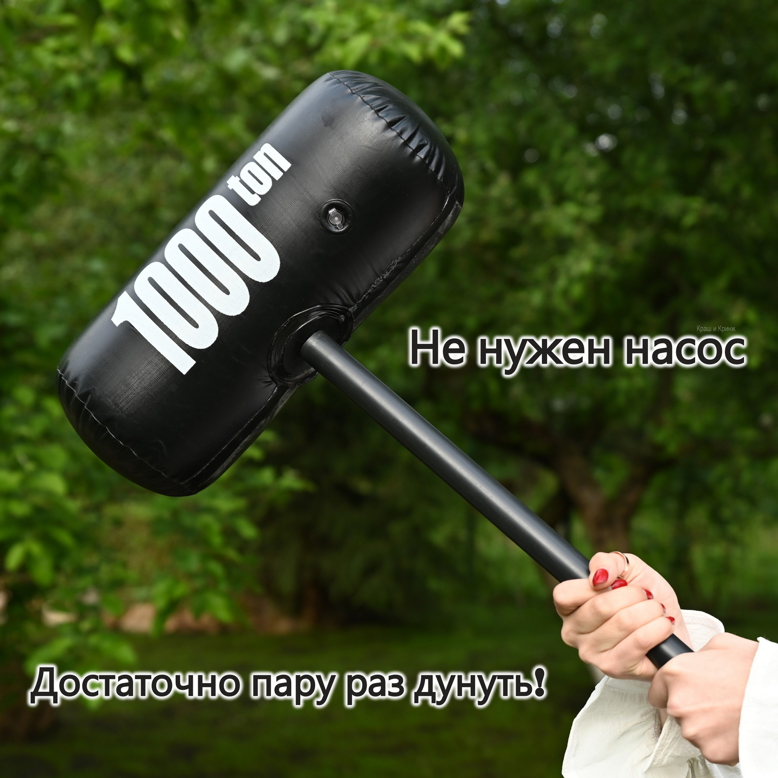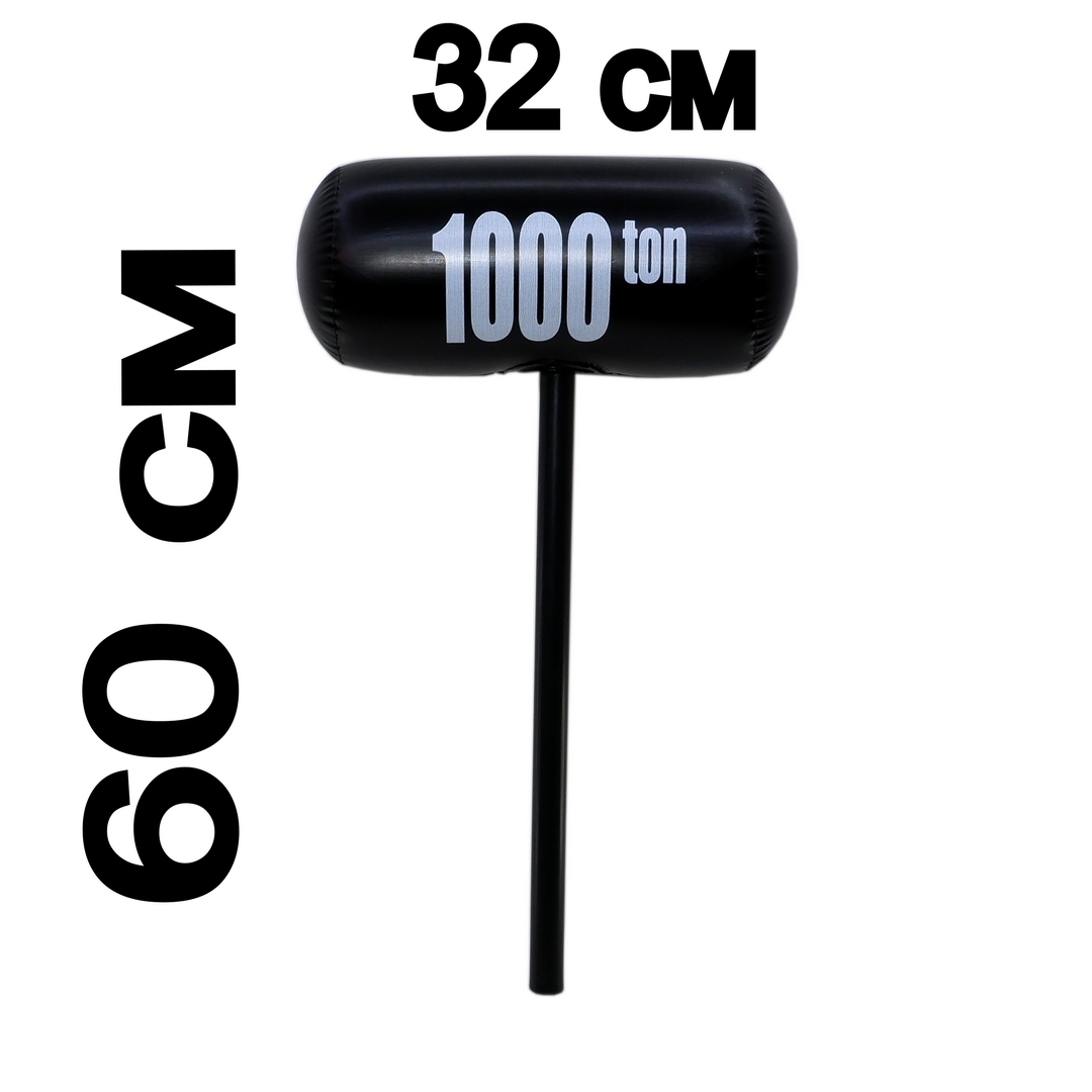 Трубка внутри полая, края скругленные, что убережет людей от случайных повреждений. Поверхность ручки гладкая и приятная, швы склеены надежно. На самом молоте нанесен принт “1000 ton”, что создает отличный визуальный эффект тяжести оружия. Навершие молота надувное, легко надувается ртом при помощи клапана, усилий много прикладывать не нужно. Игрушка состоит из двух частей, легко собирается и разбирается.