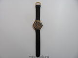 круглые, золотистые, черный циферблат, ремень черная кожа
