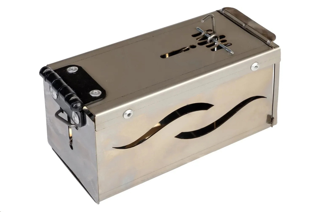 Мышеловка выполнена из нержавеющей (или оцинкованной) стали с перфорацией (боковые стенки). Ловушка закрывается дверкой под действием пружины. Принцип действия устройства: