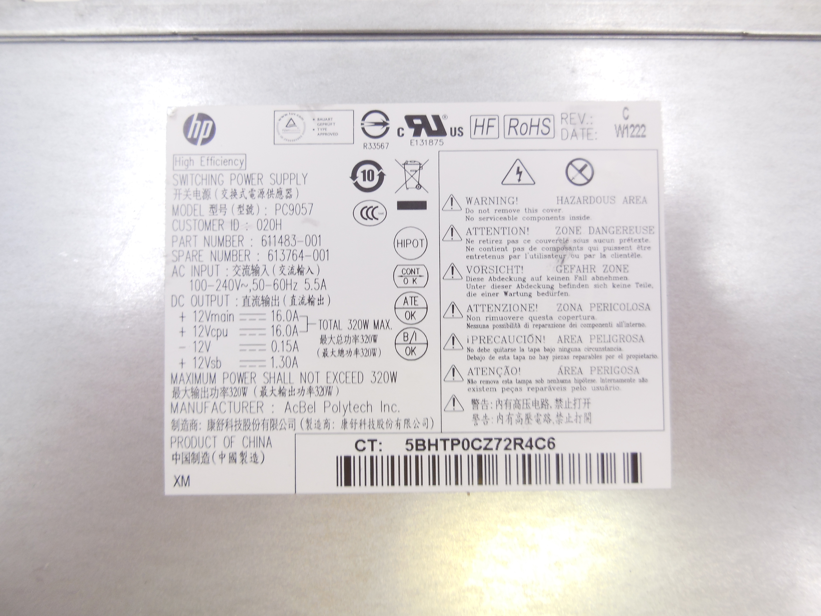 Блок питания HP 613764-001 611483-001 модель PC9057 320 Вт для 6300 Pro Elite 8300 mt DPS-320JB A