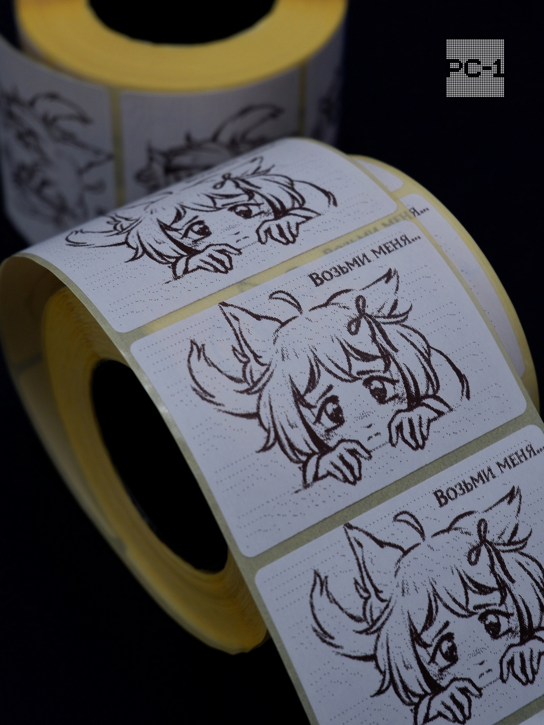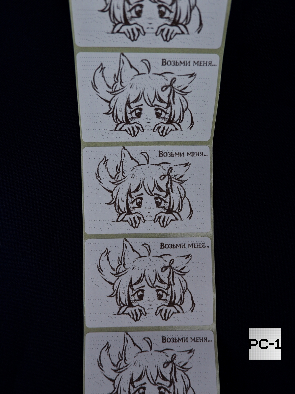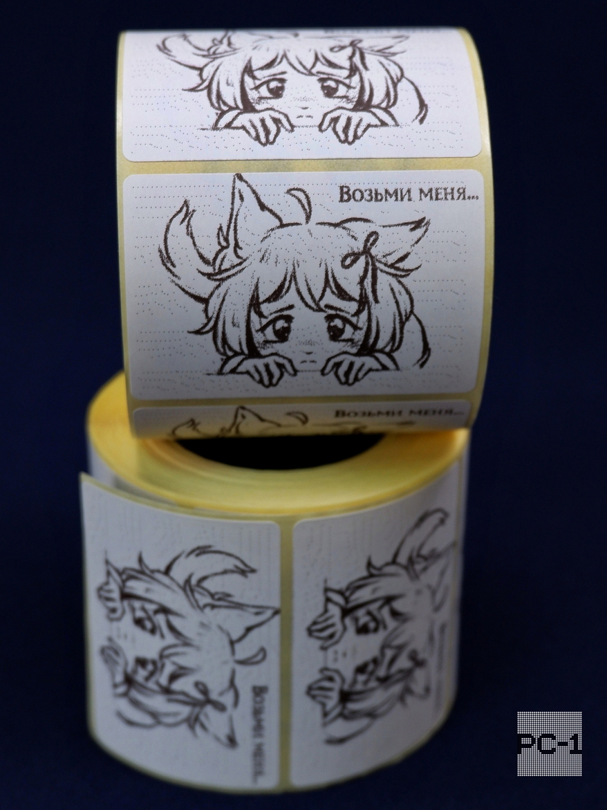 Самоклеящиеся термоэтикетки для маркетплейсов белые с черным рисунком аниме и призывам «Возьми меня...», который читается как «не делай возврат». Стикер извещает о том, что продавец товара позаботился о настроении покупателя и увеличил удовольствие от покупки (читается как — Товар упакован с любовью).